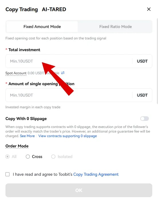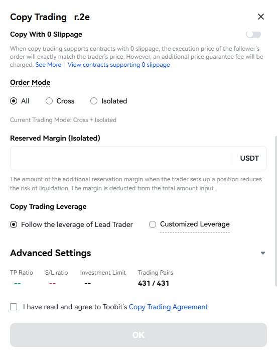 برای ادامه، باید تیک I have read and agree to Toobit’s Copy Trading Agreement را بزنید (یعنی موافقت با قوانین کپی ترید در صرافی توبیت ).